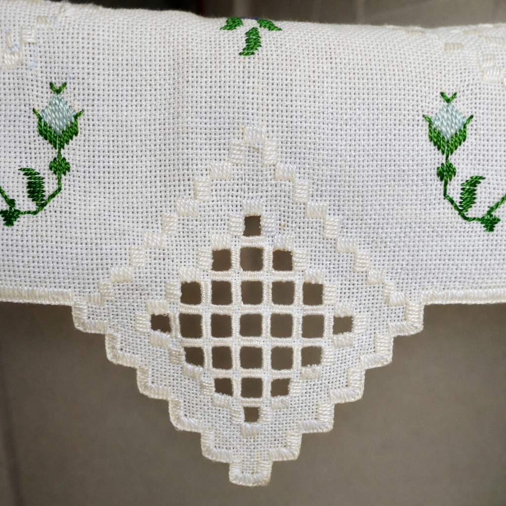 Enquanto eu produzia essa toalha de bandeja, fui pensando como os detalhes fazem diferença. Às vezes, um pequeno recorte no hardanger ou a escolha de uma cor mais suave no ponto reto muda completamente o resultado final.
