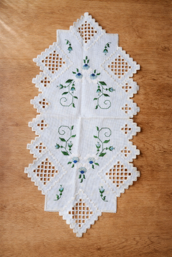 Escolhi a técnica de hardanger porque ela traz leveza e sofisticação. Seus recortes e pontos geométricos criam um efeito vazado que valoriza o tecido.