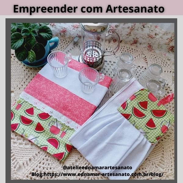 Quero falar das fotos no inicio do post, são panos de prato com barrado em tecido, produzidos aqui no atêlie e também ensinados nos cursos de costura criativa, que são ótimos para quem quer empreender com a costura.