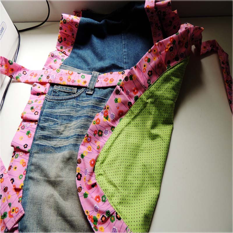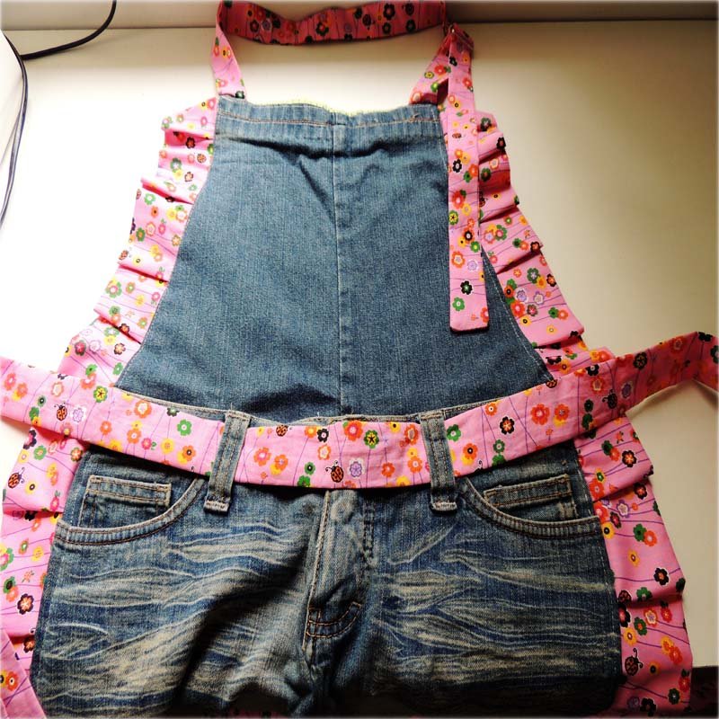 Fiz uma montagem usando a parte de baixo da calça, para fazer o peito do avental pego a parte do final da perna e costuro na cintura da calça;
