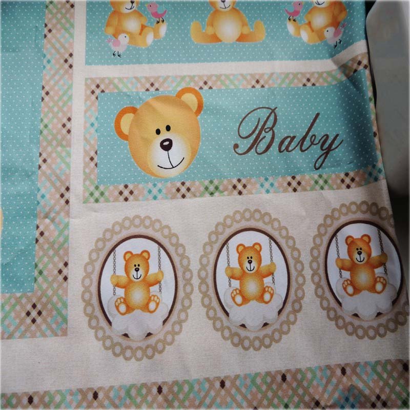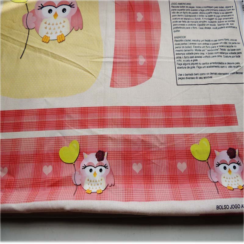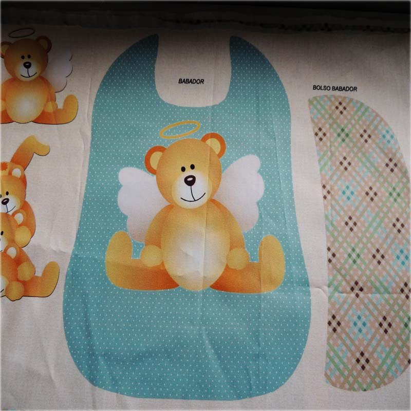 Na estampa tem um babador, uma peça de jogo americano e barrados que pode ser aplicado em fraldas, lençol ou até usar para fazer aplicação em camisetas e borys do bebê.